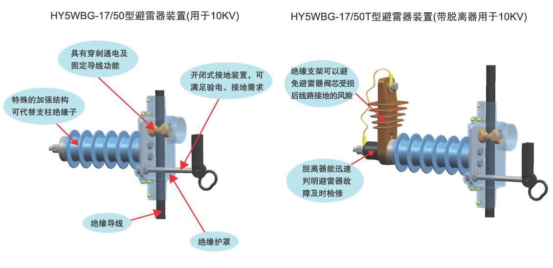 HY5WDG-17/50型氧化鋅避雷器裝置具有帶支柱功能、避雷器功能、母排接線功能、驗電接地功能的合四者功能為一體。由河間市天恒電力器材有限公司研究開發,采用這種裝置同時可減少一根避雷器橫擔(因利用了本來需要的支柱橫擔),可減少下垂線固定用的三個絕緣子,也就是減少七處剝皮點,減少施工工時,同時減少六處故障點,則能達到簡化線路裝置,進一步增加運行安全可靠性的目的,使線路更加簡潔美觀。這種裝置集成了多種功能,把原需要七處剝皮點的絕緣并在一處絕緣,并且此絕緣罩設計合理,能真正做到全程絕緣,為安全和帶電作業創造了有利條件。