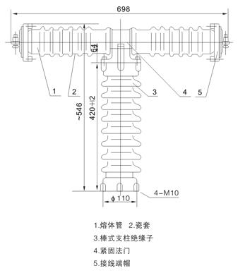 河間市天恒電力器材有限公司生產的熔斷器由熔體管、瓷套、緊固法蘭、棒形支柱絕緣子和接線端帽等組成。用壓裝的方法將兩端的接線端帽和熔體管固定在瓷套內、然后用堅固法蘭把瓷套固定在棒形支柱絕緣子上,其結構說明和外形尺寸如圖所示。